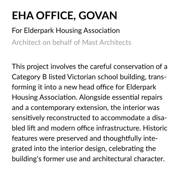 - Hillstrust School Listed Building Conversion to Office for Elderpark HA, (Mast) RIBA Stage 3-7